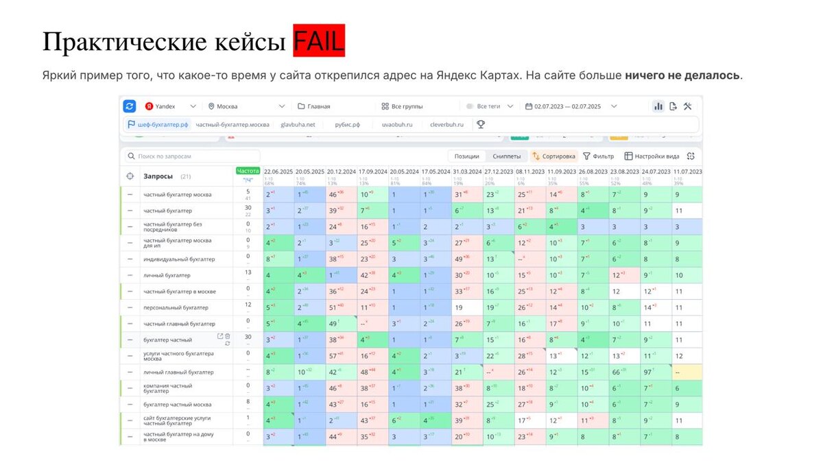 Потеря потерь или как сайт привязку на Яндекс Картах потерял. И вот результат. В мае вернули, и практически мгновенно сайт вернулся на свои законные места. На скриншоте один из слайдов моего доклада. А я здесь чтобы напомнить про это мероприятие, где вы можете задать свой вопрос по теме доклада. Оставляйте вопросы под постом https://t.me/keysso_public/1244