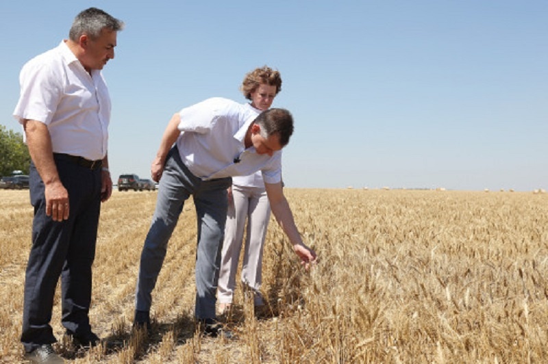 Председатель «Колоса» Василий Скорытченко рассказал руководителю региона о том, что основными направлениями хозяйства являются растениеводство и разведение КРС. В этом году семена внесли в почву на площади почти пять тыс. гектаров. Стадо КРС – более трех тысяч голов. Удой текущего года составил почти девять тысяч тонн молока, родилось 150 телят. Сельхозпредприятие уже начало уборочную страду. По словам Василия Скорытченко, если учитывать непростые погодные условия, то урожай у них неплохой, в среднем 20 ц/га. Соседние хозяйства получают намного меньше 3-4 ц/га. Секрет успеха в том, что в хозяйстве около 70 процентов посеянных зерновых – сорта местной селекции. Наибольшую урожайность дали сорта «Станичная», «Аскет», «Донская степь». «Нынешняя уборочная кампания действительно проходит в очень сложных условиях: на урожай повлияли весенние заморозки и засуха. Наши аграрии уже обработали 26% уборочных площадей и собрали 1,75 млн тонн зерна. Урожайность пока заметно ниже прошлогодней», — отм