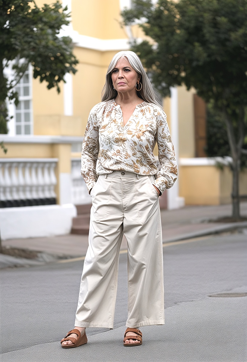 В кафе сидели две женщины явно одного возраста — где-то около шестидесяти. Одна в сером кардигане с крупными пуговицами, тёмных брюках и туфлях на низком ходу, волосы аккуратно уложены в привычную причёску. Вторая — в элегантном жакете пыльно-розового оттенка, белых брюках чуть укороченной длины и лоферах на небольшом каблучке. Разница в восприятии была разительной.