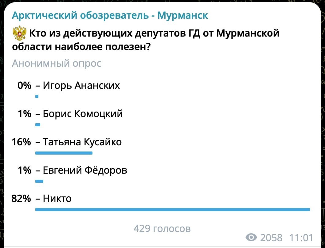 В ответ на пост Эксперимент с выбором нескольких фамилий при голосовании за полезных депутатов можно считать успешным – ботов не набежало и картина выглядит более-менее объективно. Итак, большинство проголосовавших (82%) выбрали депутата Никто – это бывший кандидат Против Всех. По одному проценту набрали Борис Комоцкий и, главная неожиданность и успех эксперимента, Евгений Фёдоров. Ноль получил Игорь Ананских. Можно поздравить Татьяну Кусайко – за неё проголосовало 16%. И пока нет ясности, пойдёт ли она в следуюший созыв, но электорат в Мурманско области у неё точно есть. Как и шансы. ❄ «Арктическй Обозреватель»