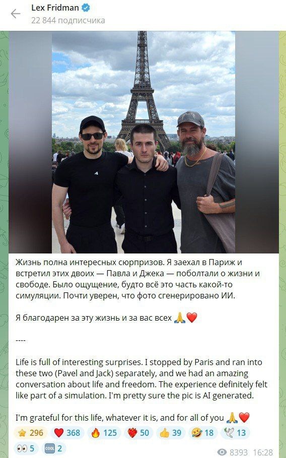 Павел Дуров, подкастер Лекс Фридман и сооснователь Twitter Джек Дорси провели встречу в Париже. Фридман поделился их совместным фото, отметив содержательную беседу о принципах свободы и смысле жизни.