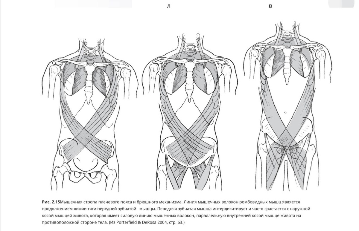 К теме как работает наше тело, что все в нем взаимосвязано. Правая верхняя сторона связана с нижней левой. Обратите внимание как устроена система косых линий мышц, благодаря которым наше тело равномерно умеет распределять нагрузку. Начиная от плевого пояса и области лопаток, далее через большие грудные мышцы, которые ниже вплетаются в передние зубчатые и наружние косые мышцы живота - все это далее двигается в противоположную сторону ниже переплетаясь с прямыми и внутренним косыми мышцами живота, частично крепятся к подвздошному гребню таза. А частично уходят ниже, вплетаясь в область мышц тазового дна и тазобедренного региона и дальше в приводящие мышцы ног. И если где-то на пути что то из этого механизма плохо выполняет свою функцию, например проблемы с работой каких либо мышц живота или зажаты тазобедренные суставы, то создается дисбаланс нарушается передача и распределение сил между всем телом. Поэтому при любых движениях нагрузка может уходить в какой-то один регион тела,