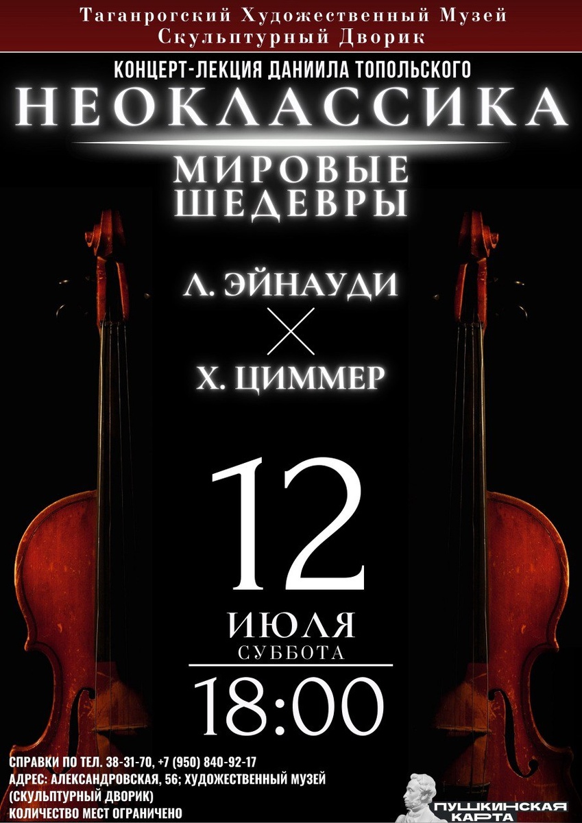 Теплым летним вечером 12 июля в 18:00 в сказочной атмосфере скульптурного дворика Таганрогского художественного музея состоится концерт-лекция «Неоклассика. Мировые шедевры». ✨ Вечер посвящен современным композиторам. В программе музыка: Л.Эйнауди, Х.Циммера, М.Рихтера, Ф.Гласса из культового мирового кинематографа. Цикл концертов-лекций «Как слушать классику» — это уникальный формат, на котором слушатели не только слушают классическую музыку в живом исполнении музыкантов-профессионалов, но и узнают: особенности авторского музыкального языка композиторов, истории и содержания конкретных произведений, особенности неоклассики, почему она тесно связана с кинематографом, как она развивается и что взяла от классической музыки — на эти и другие интересные вопросы публика получит ответы! Ждем Вас! 🤍