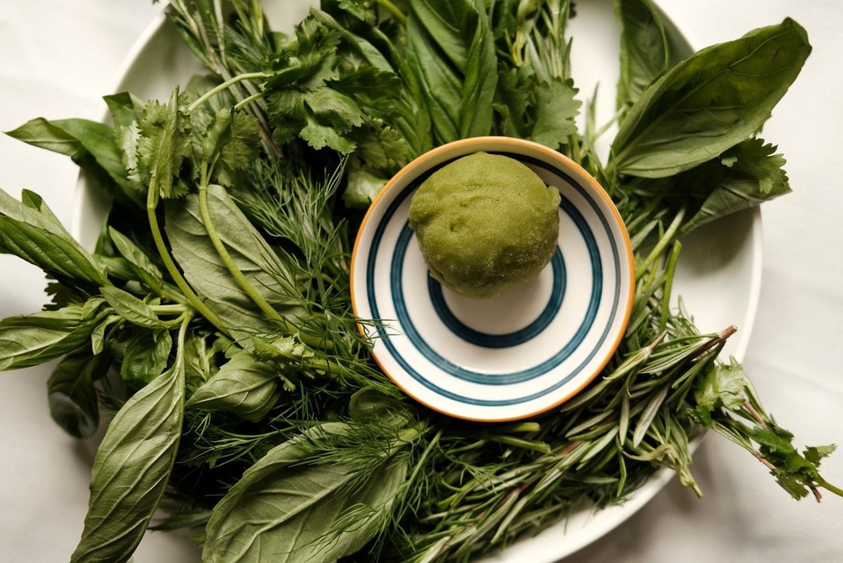 В составе сорбета базилик, укроп, кинза, тархун, мята, свежевыжатый сок лайма, яблочное пюре и сахарный сироп.