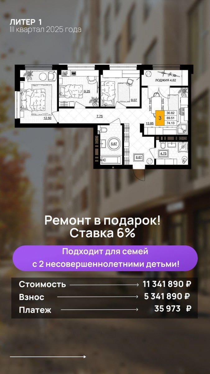 Для тех, кто желает сразу зайти и жить в своей новой квартире есть замечательный вариант: Приобретение 2-3 комнатных квартир по семейной ипотеке, с ремонтом в подарок, по ставке 6 % !!!