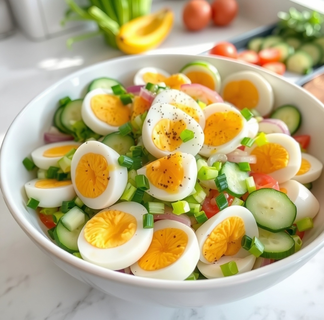**Лёгкий и вкусный салат с яйцом, зелёным луком и огурцом** Ищете простой, но очень вкусный салат, который можно приготовить за 10 минут? Тогда этот рецепт – для вас! Свежий огурец, нежные яйца и пикантный зелёный лук создают идеальное сочетание. Такой салат отлично подойдёт на завтрак, в качестве лёгкого перекуса или гарнира к мясу. **Ингредиенты** - 3 яйца (сваренных вкрутую) - 1 свежий огурец - пучок зелёного лука - 2 ст. л. сметаны или майонеза (можно заменить греческим йогуртом) - соль и перец по вкусу **Дополнительно (по желанию)** - укроп или петрушка - немного горчицы для пикантности - щепотка паприки **Приготовление** 1. **Яйца** отварите вкрутую (8–9 минут), остудите и нарежьте кубиками. 2. **Огурец** промойте и нарежьте тонкими полукольцами или кубиками. Если кожица жёсткая, можно очистить. 3. **Зелёный лук** мелко порубите. 4. Смешайте все ингредиенты в миске, заправьте **сметаной** (или майонезом), посолите и поперчите по вкусу. 5. По