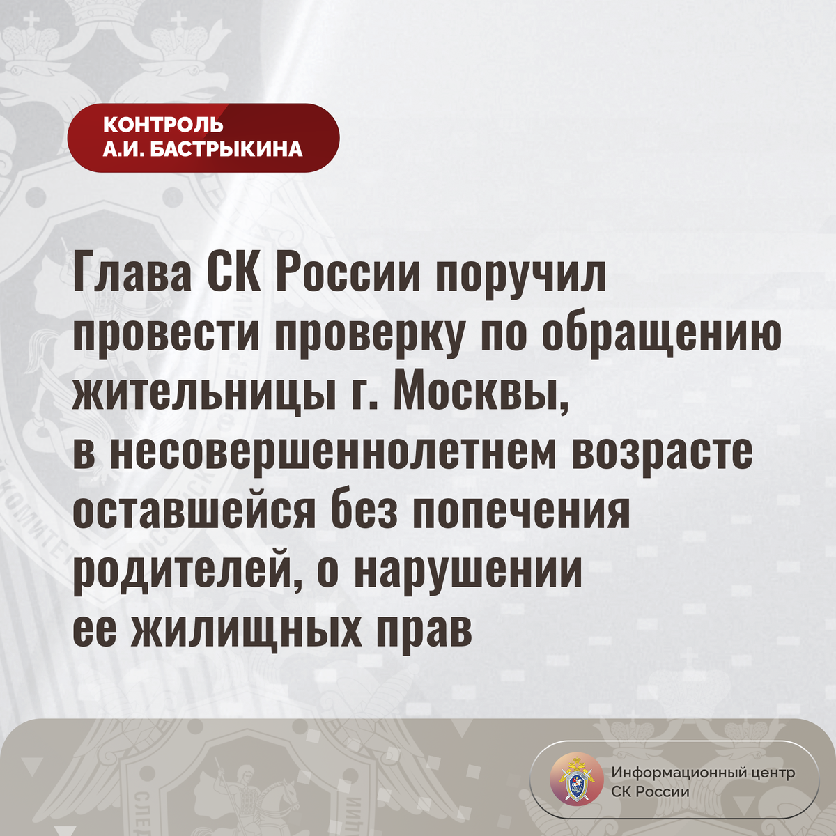 Глава СК России поручил провести проверку по обращению жительницы г. Москвы, в несовершеннолетнем возрасте оставшейся без попечения родителей, о нарушении ее жилищных прав К Председателю СК России А.И. Бастрыкину через Информационный центр обратилась жительница города Москвы, в несовершеннолетнем возрасте оставшаяся без попечения родителей, по вопросу нарушения ее жилищных прав. Девушка с прошлого года состоит на учете лиц, подлежащих обеспечению жильем, в городе Москве. Кроме того, ранее она числилась в специализированной очереди в другом регионе. Однако до настоящего времени права заявительницы не реализованы, в марте текущего года в предоставлении квартиры ей отказано. Обращения в компетентные органы результатов не принесли. Председатель Следственного комитета Российской Федерации Александр Иванович Бастрыкин поручил и.о. руководителя ГСУ СК России по городу Москве Виталию Владимировичу Саксину провести процессуальную проверку и доложить о ее предварительных и окончательных результ
