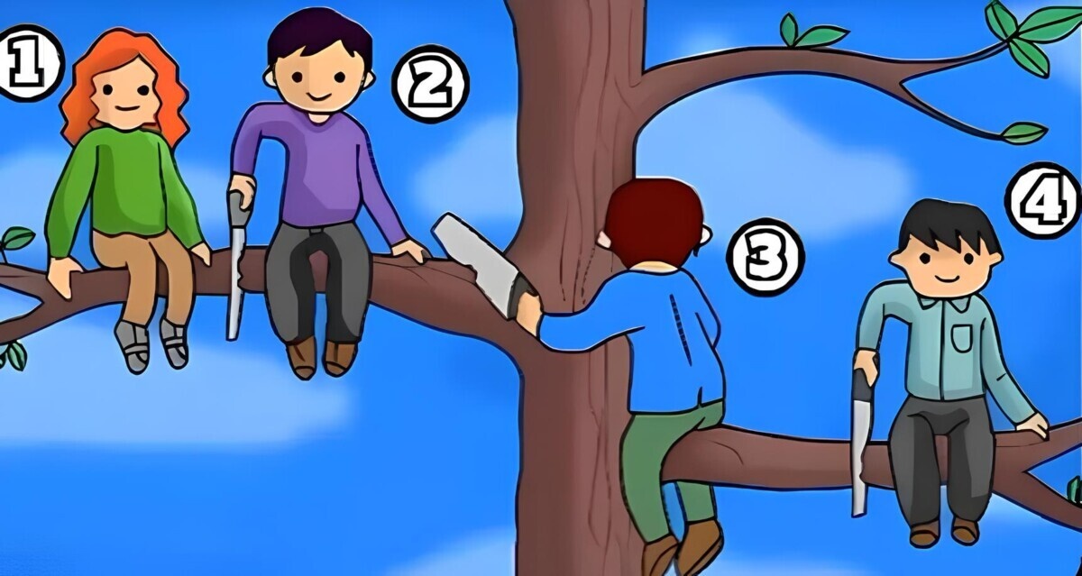 Перед вами головоломка, которая проверит ваше умение мыслить аналитически. Среди четырёх человек, сидящих на дереве, лишь один останется на месте – остальные рискуют оказаться на земле. У вас есть всего 20 секунд, чтобы определить, кто же это! Подобные головоломки завоевали огромную аудиторию по всему миру – их решают люди всех возрастов. По словам экспертов, такие задания: Перед вами иллюстрация с четырьмя людьми на дереве. Согласно условию, лишь один из них находится в безопасности. Впрочем, чтобы дать верный ответ, нужно внимательно изучить детали. Готовы? Начали! Время истекло. Готовы узнать разгадку? Если вы выбрали человека под номером 3 – поздравляем! Именно он, в отличие от остальных, сидит на прочной ветке, которую никто не пытается спилить. ... Продолжение читайте тут. (Или тут.)