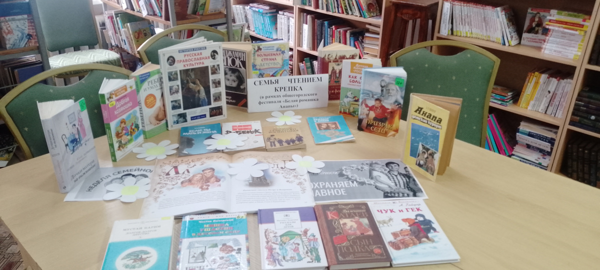 В рамках общегородского фестиваля «Белая ромашка Анапы», посвященного празднику - Дню семьи ,любви и верности ,который стартует с 4 по 8 июля ,неделей семейного чтения в Чеконской сельской библиотеке-филиале №25 для пользователей библиотеки оформлена книжно–иллюстративная выставка «Семья чтением крепка» .