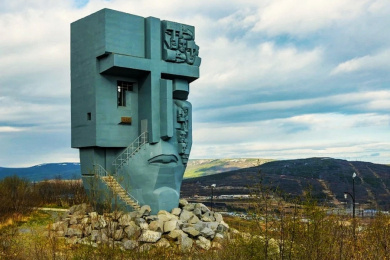 Мемориал «Маска Скорби» — одна из ключевых скульптур, посвящённых памяти жертв политических репрессий на Колыме. Высота памятника достигает 15 метров, что придаёт ему внушительный и монументальный вид на фоне сурового ландшафта Магадана. Образ мемориала выбран неслучайно. Лицо, представленное в виде маски, отражает одновременно боль, страдание и немое скорбное молчание миллионов пострадавших в 30-50-х годах XX века. Маска словно призывает остановиться и задуматься. Глубоко символична и её неподвижность — фиксирует вечный ужас и трагедию репрессий, как застывшую в памяти эпоху.