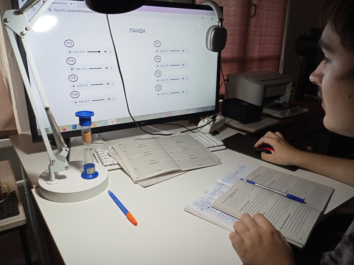 Прослушав и выполнив в тетради задание, он нажимает на кнопку "назад":