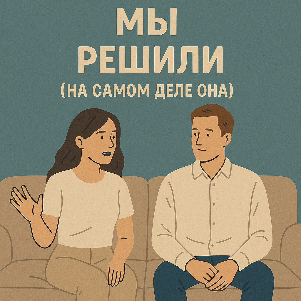 1. Кто / Что наблюдаю? Моя близкая подруга и её муж. Со стороны их отношения выглядят как пример «зрелой пары»: они не ссорятся, всё решают вместе, живут спокойно. Но недавно подруга начала обсуждать идею взять кредит и купить машину — и советовалась об этом не с мужем, а с моим парнем. Муж в это время даже не знал о её планах. 2. Что видно снаружи? Она часто говорит, что у них всё идеально: «у нас всё вместе, мы так классно понимаем друг друга». Но со стороны видно, что все решения принимает она. Потом она преподносит это как общее решение, говоря: «мы подумали и решили». Муж в это время сидит тихо, соглашается со всем, будто безвольно. У него нет своего голоса. Он либо не привык его проявлять, либо давно разучился. 3. Что чувствуется нестыковкой? Она транслирует: «У нас всё классно, у нас — партнёрство», но на деле — монолог в её исполнении, а не диалог. Она говорит: «Мы вместе решили», а сама — идёт советоваться с другими мужчинами, но не с мужем. Говорит, что они не ссорятся. А