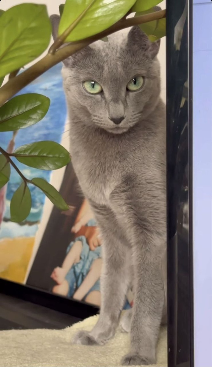 Кот молодой, светло-серый, худой, гладкошерстный.