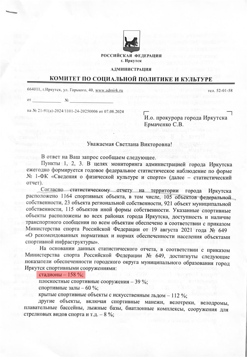 📊 Мы знаем процент доступности спортивных объектов в городе — этот показатель один из самых низких в стране — всего 13%! Эти данные Минспорта предоставляло Общественной палате. Но есть правда, есть ложь, а есть статистика. Видя всё это плачевное состояние, иркутские власти решили не решать проблему, а искусственно подкрутить статистику. В своём официальном ответе местным жителям администрация сообщает, что город обеспечен стадионами аж на 158%! То есть расслабляемся — все проблемы решены!