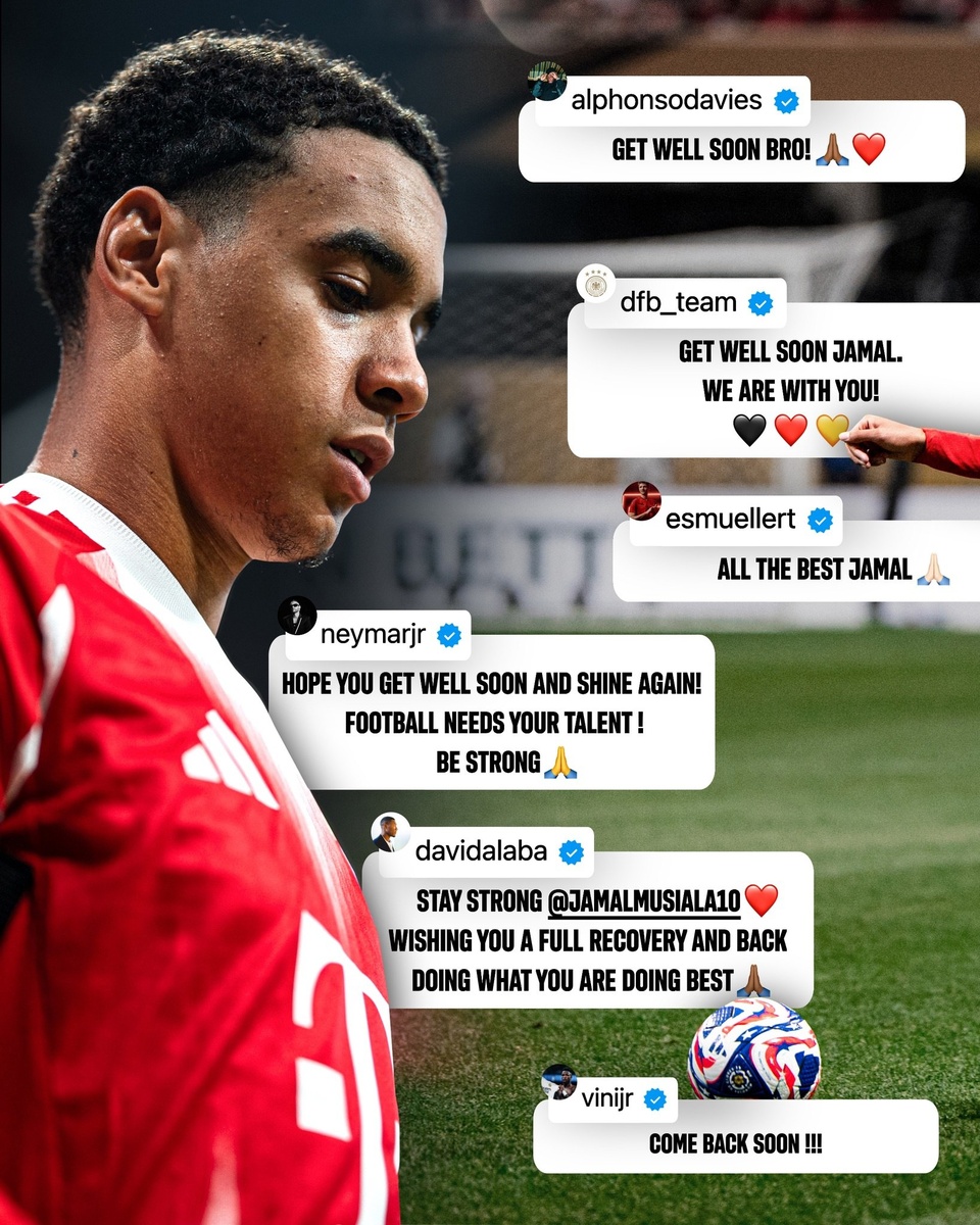 Вирц, Неймар, Рибери, ПСЖ и другие поддержали Джамала Мусиуалу! ❤🤍 8 июля 2025 года игрок мюнхенской "Баварии" успешно перенес операцию после перелома малоберцовой кости и вывиха лодыжки во время матча клубного чемпионата мира против "Пари Сен-Жермен", сообщается на сайте немецкого клуба.