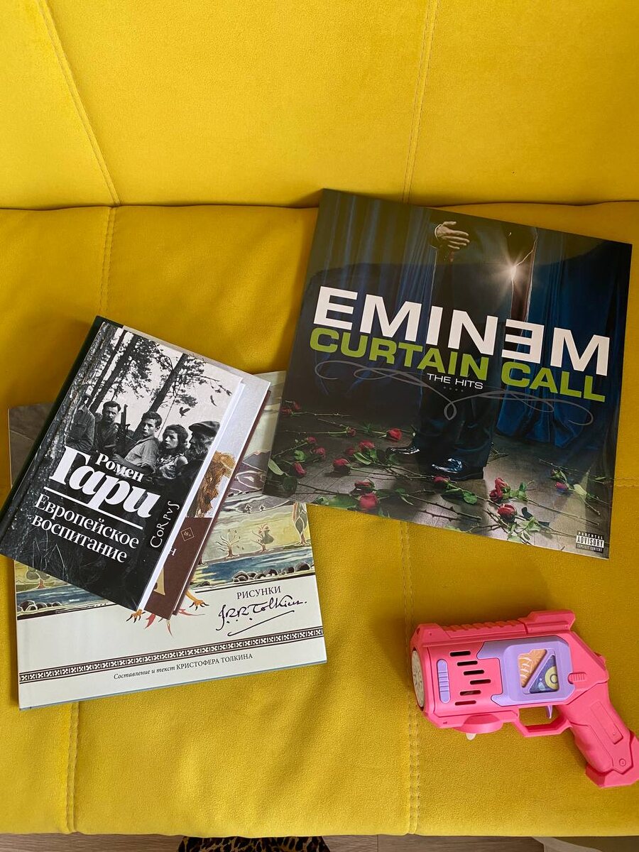 Егор пришел с работы с подарками, люблю такое 🥰 Новые книги - это нам всегда надо. Новенький Ромен Гари для депрессивного настроения. Хотя он в принципе любое настроение сделает депрессивным… Лучшие песни Эминема на виниле и пистолет для мыльных пузырей. Даже не знаю, чему больше рада 😀