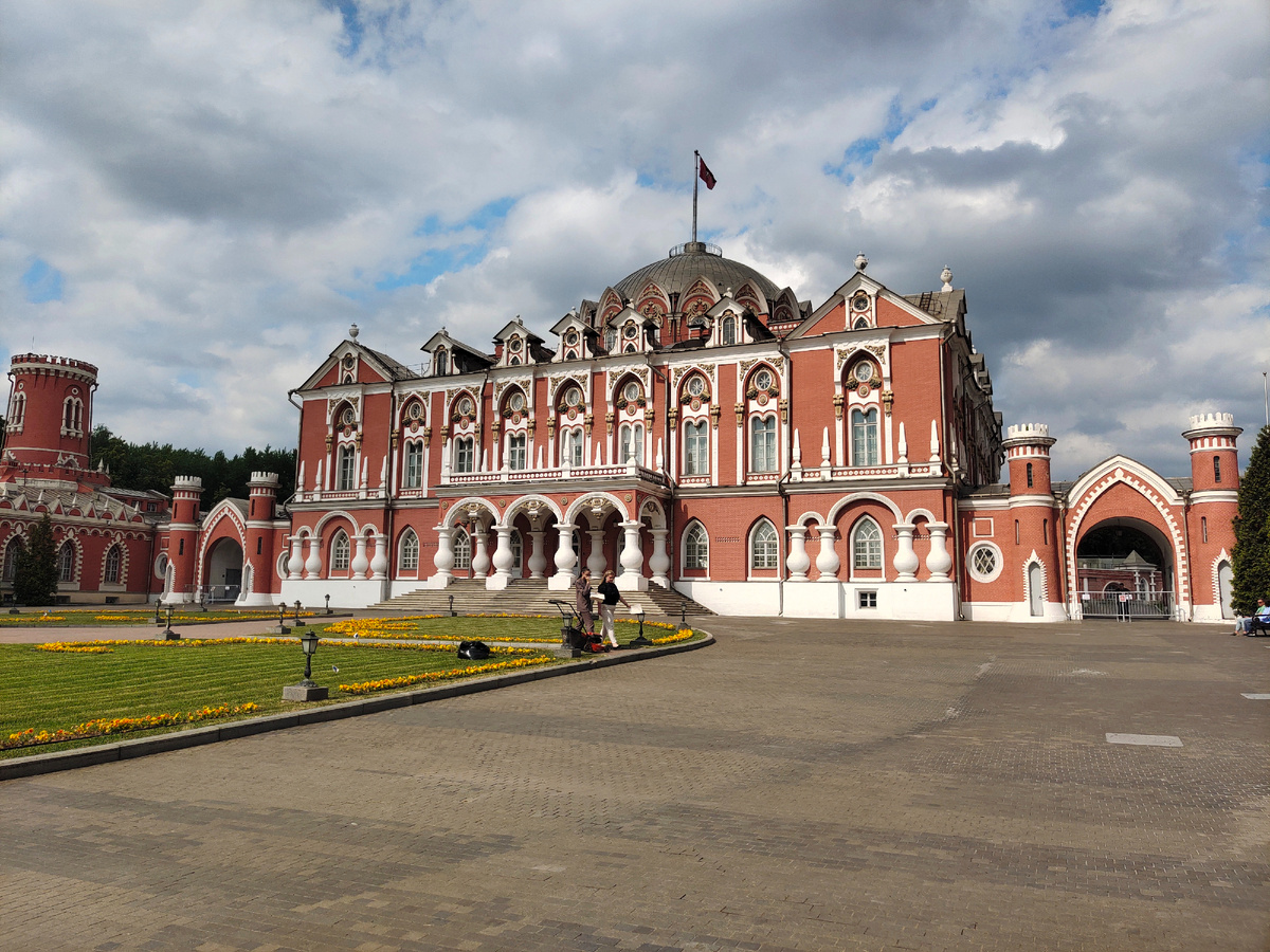Петровский путевой дворец - это тот самый нарядный массив бело-красных зданий на Ленинградке. В конце XVIII века архитектор Матвей Казаков спроектировал его в псевдо-готическом стиле. Этот стиль вам знаком по облику Царицына - своеобразный сплав готики, древнерусского и восточного стилей. Дворец "Петровский" - потому, что построен на землях Высоко-Петровского монастыря. А "Путевой" - оттого, что располагался на одном из важнейших трактов страны, прям перед въездом в Москву. Тут надо помнить, что путешествовать в те времена было долго и очень неудобно. Поэтому на крупнейших дорогах строили путевые дворцы для остановки и отдыха царствующих особ и их приближённых. Екатерина II два раза останавливалась в Петровском дворце; Николай II перед своей коронацией тоже размещался здесь. У этого дворца был ещё один очень именитый, но незваный и нежеланный посетитель: Наполеон. Именно это место император Франции выбрал для своей ставки после долгого пути на Москву: Вот, окружен своей дубравой,