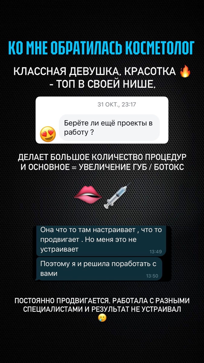 Моя задача — обеспечить косметологов стабильным потоком клиентов, без “слива” бюджета, демпинга и пустых сообщений.