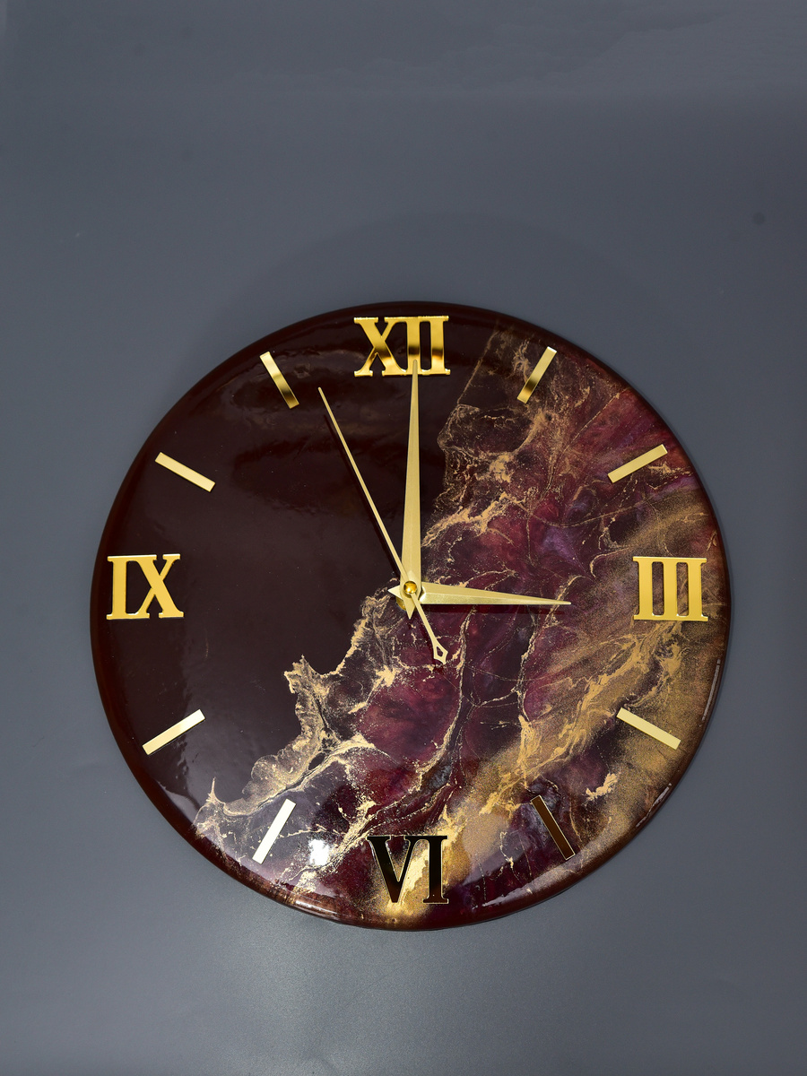 Летний Пунш в Часах: Вино, Золото и Карамель (Эксклюзив в Одном Экземпляре!) МДФ, эпоксидная смола цвета винного пунша, всплывающее золото, зеркальный циферблат и карамельный край. Часы, наполненные теплом лета и свободой. Привет! С вами снова Нелли, мастер, который дышит жизнью в эпоксидную смолу, глину и воск, создавая эксклюзивные подарки и интерьерные акценты. Сегодня хочу поделиться с вами особенной работой – часами, которые родились из ощущения лета, свободы и той легкой, игристой атмосферы, что царит в бокале охлажденного винного пунша. Представляю вам мои Часы "Летний Винный Пунш" – уникальный арт-объект, функциональный и невероятно теплый. Основа: Надежность МДФ и Тепло Карамели Как всегда, залог долговечности – прочная и ровная МДФ-панель. Но на этот раз я решила добавить изюминку прямо с краю! Торцы часов оформлены эффектом карамели. Этот глубокий, теплый, почти янтарный оттенок обрамляет основную композицию, создавая потрясающий контраст и добавляя работе удивительно "вкус