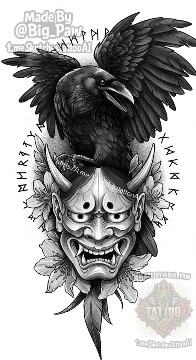 #2582 Подборка по запросу подписчика - Можно подборку тату с вороном с добавлением славянских рун и цветком Ликориса, и маской они| 😎 Руны в нейросети это беда, и всё что априори славянское для неё скандинавское, поэтому тут ручками добавлять нужные надо 🧠 SYNTX 💳 Донат 😎 НейроБро 😎 Эскизы без вотера 💀 Эскизы от нейросети #они #ворон #цветы
