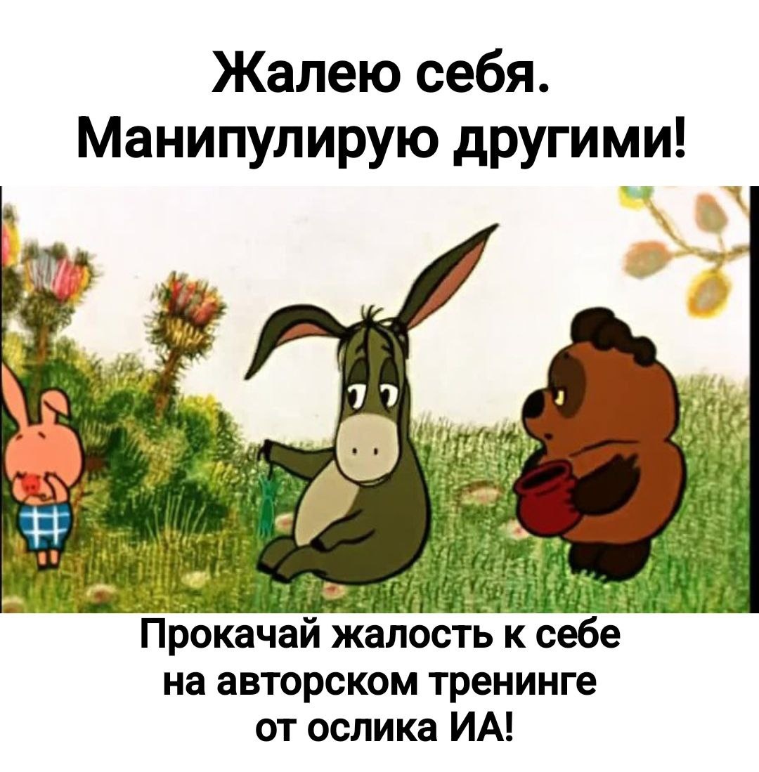 Так кого же «защищает» саможаление в виде якобы защитного механизма психики?! Ну если только Ослика Иа. Ведь, по сути, лучшая иллюстрация защитного механизма психики в виде жалости к себе - это вечный Ослик Иа…