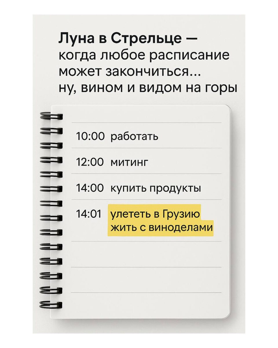 Настроение дня Луна в Стрельце 🗓️9 июля 00:43 до 11 июля 09:35 Ожидается подъём духа, тяга к свободе, приключениям, новым знаниям и внезапному желанию бросить всё и уехать в ашрам (или хотя бы на дачу без связи) 🔵Что чувствуется: - желание философствовать - непреодолимая тяга поучить других жизни (осторожно - не все оценят) - резкие перемены настроения, если вас кто-то ограничивает - вдохновение, путешествия, мечты и непрактичные идеи 🔵Как не словить ментальный перегрев: - не спорьте, особенно с начальством и близкими. Стрелец не терпит давления, а Луна в нём - тем более - заземляйтесь: прогулки, тело, дыхание. Меньше теорий, больше практики - не превращайте поиск смысла жизни в драму на кухне - пишите, читайте, медитируйте - ум требует пищи высокого уровня Луна в Стрельце - хорошее время для духовных практик, йоги, чтения мудрых текстов, да и просто размышлений о своей дороге. Главное не забывайте возвращаться на Землю🤓