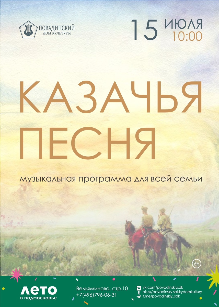 Мы приглашаем всех желающих на музыкальную программу «Казачья песня». Вы узнаете, какие традиции и обряды присущи казачьей культуре и как они отражаются в их песнях🐎