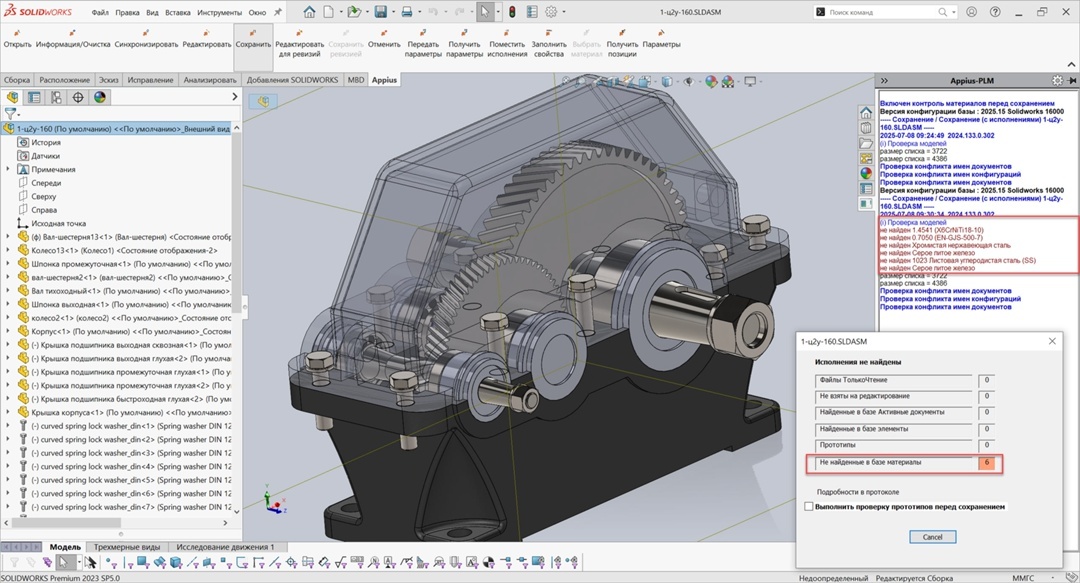 В новой версии расширен функционал контроля, выполняемого при сохранении данных в систему Appius-PLM. Добавлен контроль соответствия материалов, указанного в рамках деталей, с ограничительным перечнем материалов Конструкторско-технологического справочника. Активная настройка проверки разрешает загрузку только тех материалов, которые уже есть в базе. Если материал не создается, как объект, то контроль не осуществляется. Во время сохранения детали с материалом, которого нет в базе данных, в окне проверки отображается предупреждение с количеством таких деталей «Не найденные в базе материалы». Материал, не найденный в базе, указываются в протоколе красным цветом. Для успешного сохранения, необходимо указать корректный, существующий в базе материал, либо отключить проверку. Активация проверки для всех пользователей доступна только Администратору системы. Для этого применяется специализированная локальная константа «SolidWorksMaterialControl», которую можно создать в одноименном справочнике