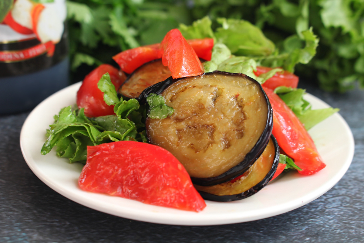 Самое любимое сочетание - жареные баклажаны+помидоры. Летом готовлю много разных салатов с помидорами и жареными баклажанами. Этот салат простой, но очень вкусный. Салат яркий, ароматный, сочный. Приготовление много времени не займет. Все ингредиенты даны условно, всегда можно добавить больше или меньше баклажанов, помидоров, чеснока. Помидоры для приготовления желательно брать небольшие, плотные, их удобно нарезать дольками. Если помидоры крупные, то их лучше нарезать полукружочками. Такой салат хорошо сразу подать к столу, пока зелень объемная и аппетитная. Баклажаны - 300 г. Помидоры - 200 г. Листья салата - 1 большой пучок Чеснок - 1 зуб. Соус бальзамический - 1 ч.л. Масло растительное для жарки - 50 мл. Соль - по вкусу Баклажаны нарежем не очень тонкими кружочками. На сковороде разогреем масло и обжариваем баклажаны с двух сторон до румяного цвета. Жареные баклажаны выкладываем и даем им остыть. Помидоры нарежем дольками и выложим в салатник. Выложим жареные баклажаны в салатник.