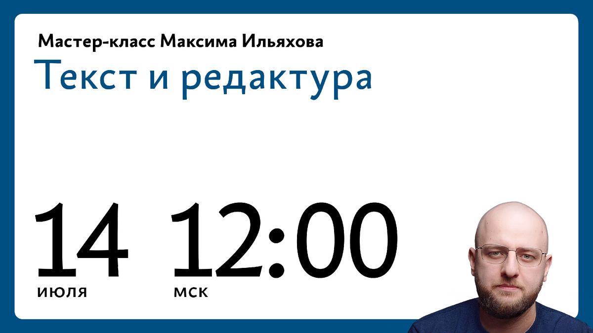 В понедельник 14 июля в 12:00 мск Максим Ильяхов проведёт мастер‑класс о тексте и редактуре, а участники смогут задать вопросы. Максим — ректор Школы редакторов, автор книг «Информационный стиль», «Как написать», соавтор книги «Пиши, сокращай» и основатель сервиса «Главред». Максим в прямом эфире ответит на вопросы и разберёт ваши тексты, посты в соцсетях, личные страницы, рассылки, сайты. Приходите со своими примерами. Мастер‑класс будет полезны редакторам, дизайнерам, менеджерам, маркетологам и всем, кто работает с текстом. Записаться на мастер‑класс