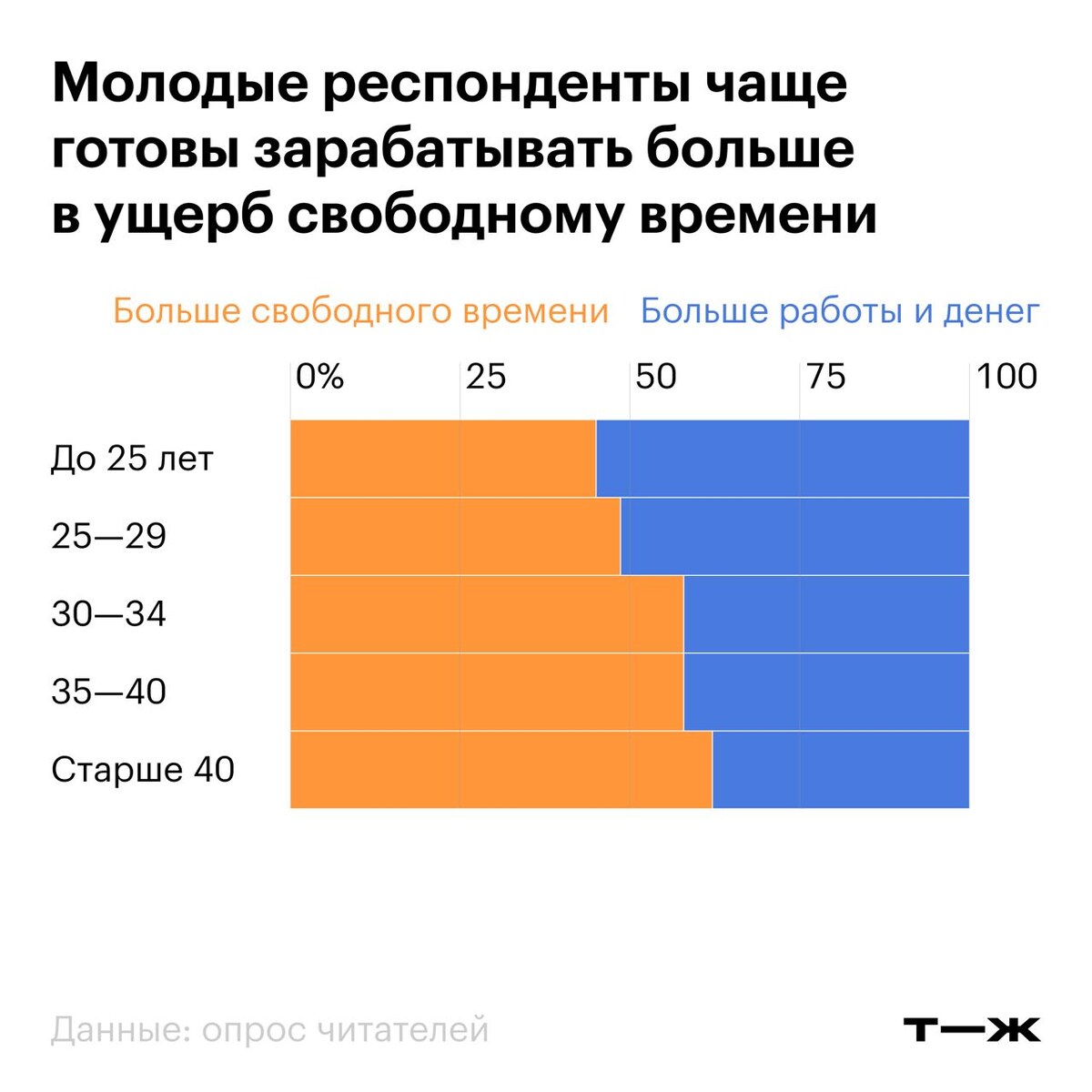 🔷Почти 55% читателей Т—Ж предпочли бы иметь больше свободного времени и меньше денег, а не повысить доход, но меньше времени уделять