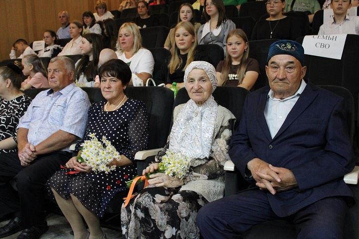 Возле крыльца была установлена фотозона из ромашек – символа праздника. Здесь в ромашковых венках фотографировались все желающие гости. На входе в зрительный зал каждому вручался букет ромашек. Открыл торжество гимн семье «Храните друг друга во все времена» в исполнении ансамбля «Архангельская краса». Первыми начали чествовать юбилейные пары. Среди них были супруги со стажем от 25 до 60 вместе прожитых лет. Ведущие подробно рассказали о создании каждой семьи, ее трудовой деятельности и нравственных ценностях. В этом году медали «За любовь и верность» удостоены Нафис и Гульназ Исмагиловы из села Тубылгы Тау. Это село - родина главы семьи. Уроженка Набережных Челнов Гульназ стала его женой в 18 лет. Семья Исмагиловых крепкая и дружная и является достойным примером для остальных. Супруги вырастили четверых детей, имеют шестерых внуков. Сын Эльнар защищает страну на СВО, продолжая воинскую традицию отца, ветерана афганской войны. Дочь Эльмира с мужем Ильгизаром занимаются волонтерской деят