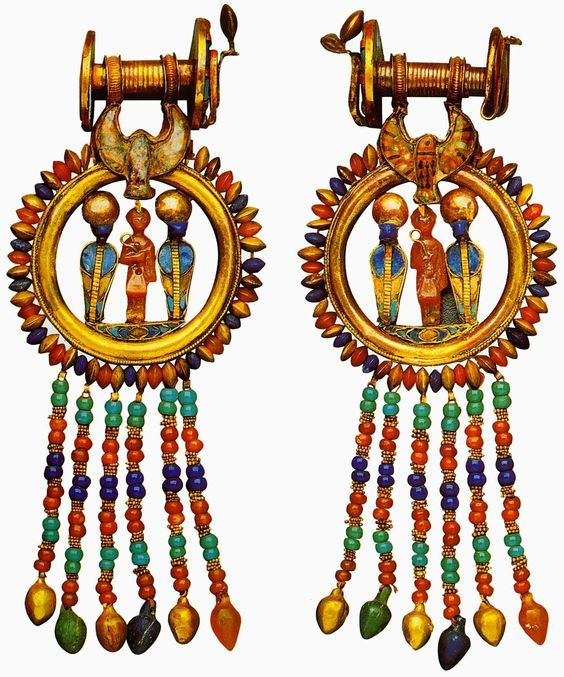 Все, без исключения, серьги Тутанхамона — это не только изысканные образцы древнеегипетского ювелирного искусства, но и свидетельство художественного и культурного расцвета XVIII династии в эпоху Нового царства. И вот такие, с мини-статуэткой царя между уреями: И такие, с уточками: Но эти серьги особенно выделяются тем, что при их изготовлении использовалась техника грануляции — сложный метод, при котором на поверхность прикрепляются мельчайшие золотые шарики, образующие замысловатые узоры: Такой метод декора требовал исключительной ловкости и аккуратности: каждая бусина размещалась и спаивалась умелыми руками, что свидетельствует о выдающемся мастерстве египетских ремесленников. Подвески изготовлены не только из золота, но и украшены лазуритом — полудрагоценным камнем глубокого небесно-голубого цвета, который часто ассоциировался с божественностью и царской властью. Кроме того, в их изготовлении использовался фаянс — глазурованный керамический материал, имитирующий более ценные вещес