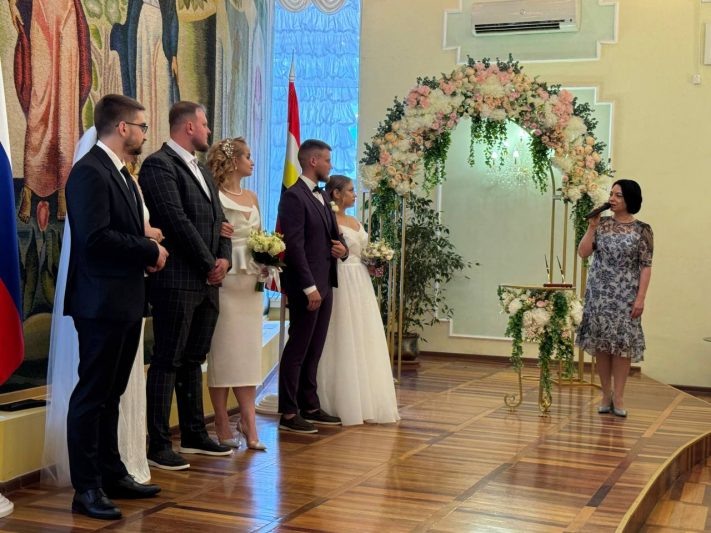 В День семьи, любви и верности по всему региону состоялись торжественные мероприятия. Вчера, 8 июля, по всей России отмечали День семьи, любви и верности. По этому поводу в Центральном ЗАГСе Курска состоялась одновременная, тройная регистрация брака. Одна из пар образовалась около года назад. Он — участник СВО, она — врач онколог. Влюбленные познакомились во время передачи гуманитарной помощи. Жених рассказывает, что сделал предложение любимой через пол года с начала отношений, но понял он, что встретил свою судьбу еще в день знакомства. Супруги выбрали дату не специально: 8 июля выпало на отпуск бойца, поэтому влюбленные без лишних раздумий поняли — это судьба. Помимо одновременной регистрации брака 8 июля в Центральном отделении ЗАГС прошло чествование «золотых» юбиляров. Семь Игнатьевых официально закрепила свою любовь 50 лет назад. Владимир Васильевич художник, член Союза художников России. Светлана Александровна — доцент КГУ. В счастливом браке они воспитали двоих детей, а сейчас