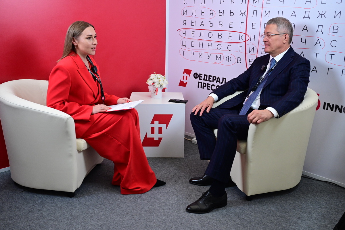 Глава Башкортостана Радий Хабиров на площадке Международной промышленной выставки «Иннопром-2025» в Екатеринбурге дал интервью информационному агентству «ФедералПресс».