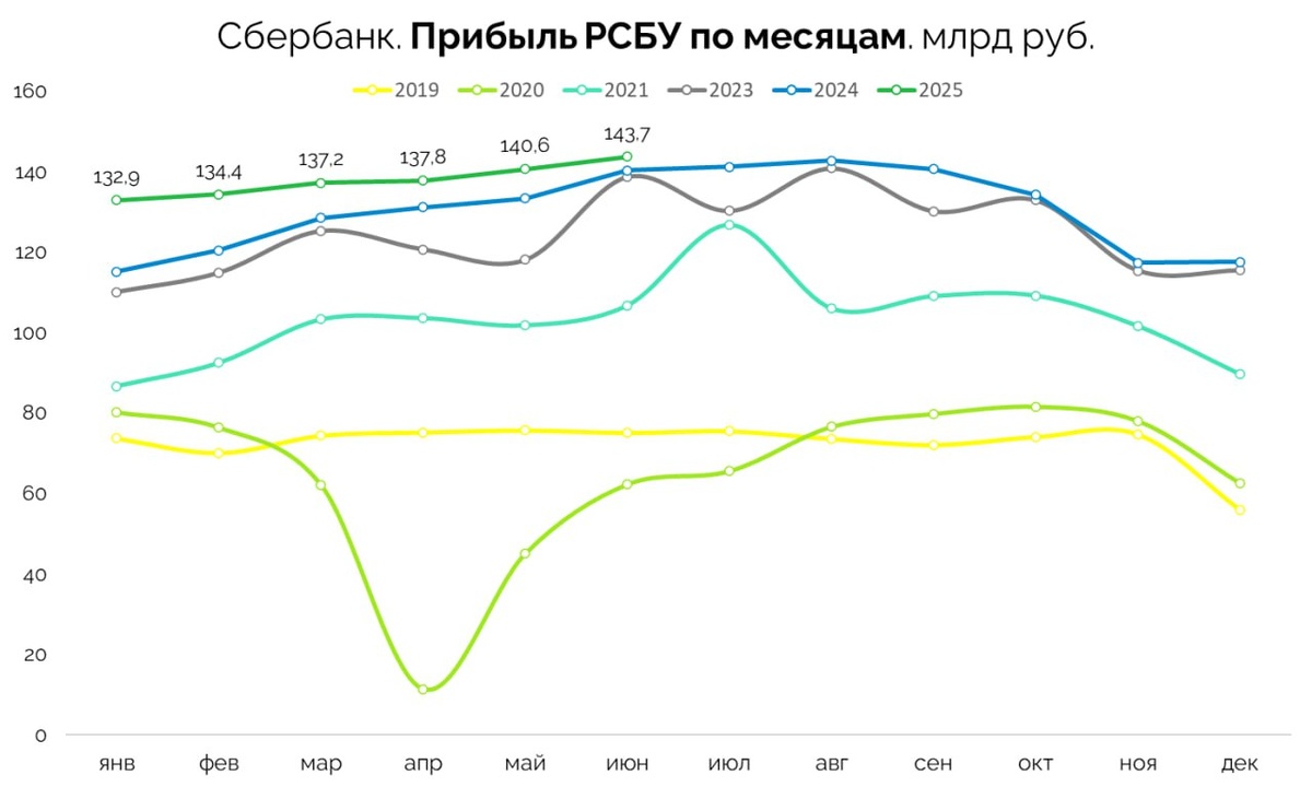 🏦 Сбер продолжает наращивать прибыль по РСБУ — I пол. 2025 г. +7,5%. Коротко о главных цифрах из отчета за 6 месяцев 2025 г.: — Кредиты розничных клиентов прибавили с начала года 0,9% (18 трлн руб.). И это при заградительной ключевой ставке и сокращении льгот в ипотеке. Портфель корпоративных кредитов снизился на 0,9% — до 27,517 трлн руб. — Чистые процентные доходы в июне выросли на 21,8% г/г — до 252,2 млрд руб. на фоне высоких ставок в экономике. Комиссионные доходы, наоборот, упали на 6,7% г/г — до 59,7 млрд руб. Сказывается отсутствие комиссий в ипотеке и низкая экономическая активность в стране. — Затраты на резервы и переоценки снизились на 24,2%. Чистая прибыль выросла на 7,5% — до 826,6 млрд руб. Стоимость риска выросла до 1,5% в июне (1,3% в мае) — третируемый банком уровень. Проблем с достаточностью (как это бывает у ВТБ) никак нет. Показатель в июне составил 14,1% (необходимый — 8,5%). Выплата дивов существенно не повлияет. ⭐️Мнение GIF В целом Сбер идет по траекто