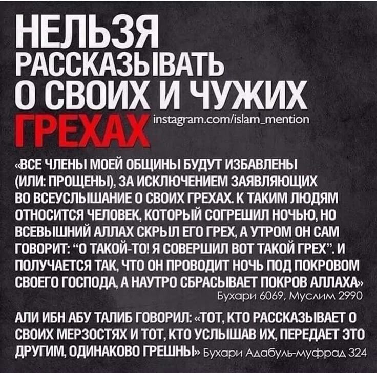«Все члены моей общины будут прощены, за исключением заявляющих о своих грехах. К таким людям относится человек, который согрешил ночью, но Всевышний скрыл его грех, а утром он сам говорит: „О, такой-то! Я совершил грех“. И получается так, что он проводит ночь под покровом своего Господа, а наутро сбрасывает покров Аллаха» (Бухари, 6069; Муслим, 2990)