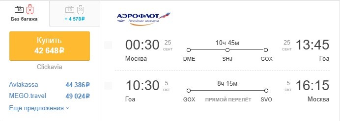 ✈️Москва - Гоа (Индия), одна пересадка в Шардже, туда и обратно за 42650 рублей