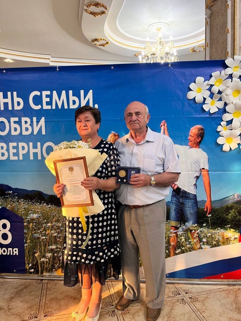В этот вечер супругам Хатламаджиянам была вручена общественная награда - медаль “За любовь и верность”, учрежденная оргкомитетом по проведению Дня семьи, любви и верности в Российской Федерации, а также грамота.