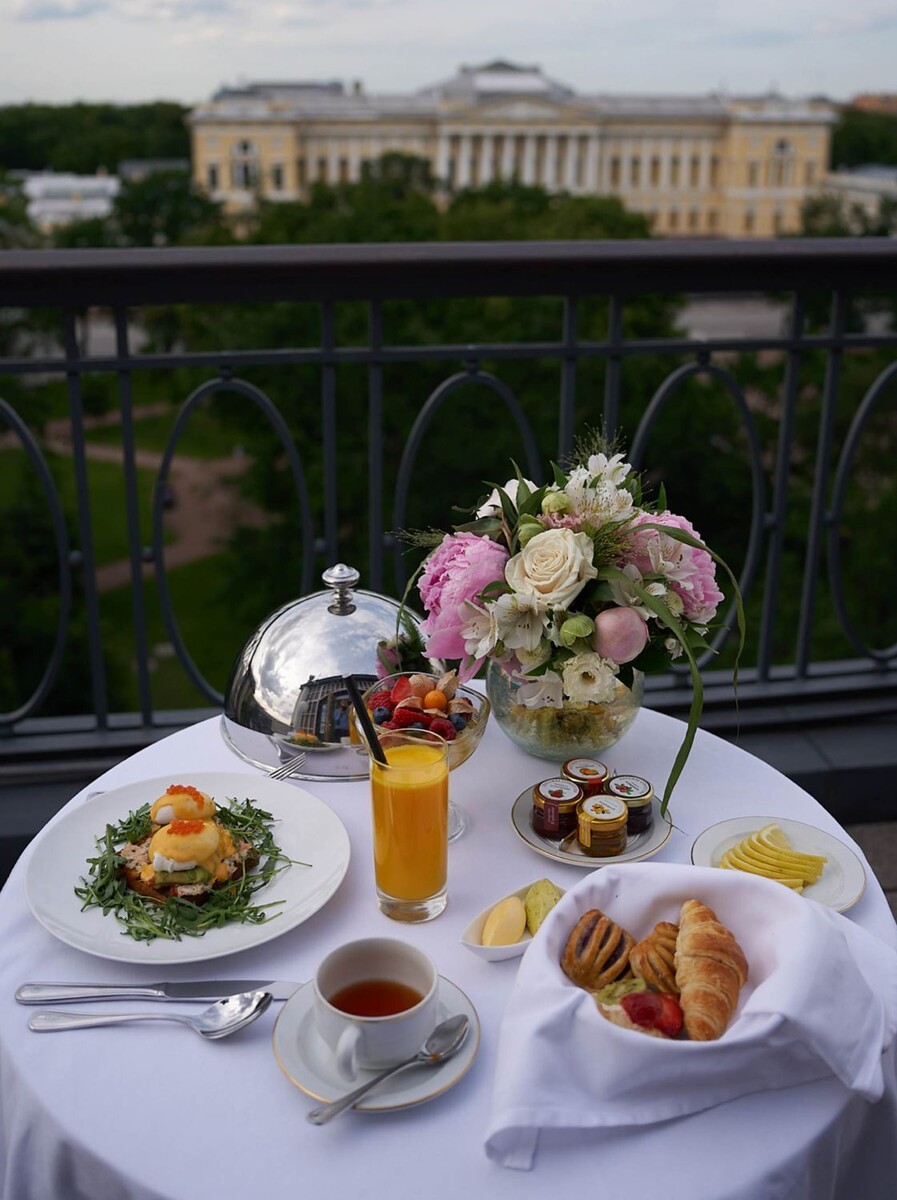 «Гранд Отель Европа» знает рецепт идеального летнего утра и представляет петербургский завтрак от шеф-повара Дениса Соболева, в который вошли как блюда эпохи Петра I, так и современные гастрономические тренды. А главным его ингредиентом стала возможность любоваться великолепными видами города, не покидая своего номера. Рассказываем подробнее. Идеальное летнее утро — какое оно? Здорово, когда ты просыпаешь в красивом месте и не нужно никуда спешить. Ещё лучше, когда вместо обжигающего кофе, выпитого на бегу, ты можешь насладиться вкусным завтраком. Идеально — когда вокруг тебя атмосфера спокойствия и виды, которые радуют глаза и наполняют энергией, дарят хорошие эмоции. Многие из нас устраивают себе мини-путешествия, отправляясь на пару дней в северную столицу: просто погулять, сменить картинку, переключиться на что-то новое. «Гранд Отель Европа» всегда готовит что-то необычное, мы возвращаемся туда вновь и вновь. Особой популярностью в летнее время пользуются номера с террасами, которы