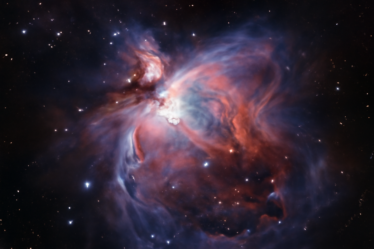 Иногда хочется просто замереть и посмотреть вверх. Среди миллионов звёзд и туманностей есть одна, которую видно даже невооружённым глазом — в поясе Ориона, среди ярких звёзд, чуть ниже среднего пояса, мерцает туманность Ориона. Она не просто красива. Она живая. Она двигается, дышит, расширяется. И недавно астрономы выяснили, почему. Туманность Ориона — это не просто яркое пятно на ночном небе. Это настоящие звёздные ясли. Здесь на свет появляются звёзды — тысячи молодых светил уже родились, и ещё тысячи — в пути. Расположена эта туманность примерно в 1400 световых годах от нас, и её размеры поражают: около 15 световых лет в поперечнике и масса — как у 10 тысяч Солнц. Здесь нет покоя. Это кипящее облако газа, пыли и энергии, в котором буквально формируется будущее. Самые молодые звёзды здесь ещё даже не начали светиться по-настоящему — они называются протозвёздами, и в их недрах только готовится к запуску термоядерный синтез. Недавние наблюдения показали: центральная часть туманности Ор