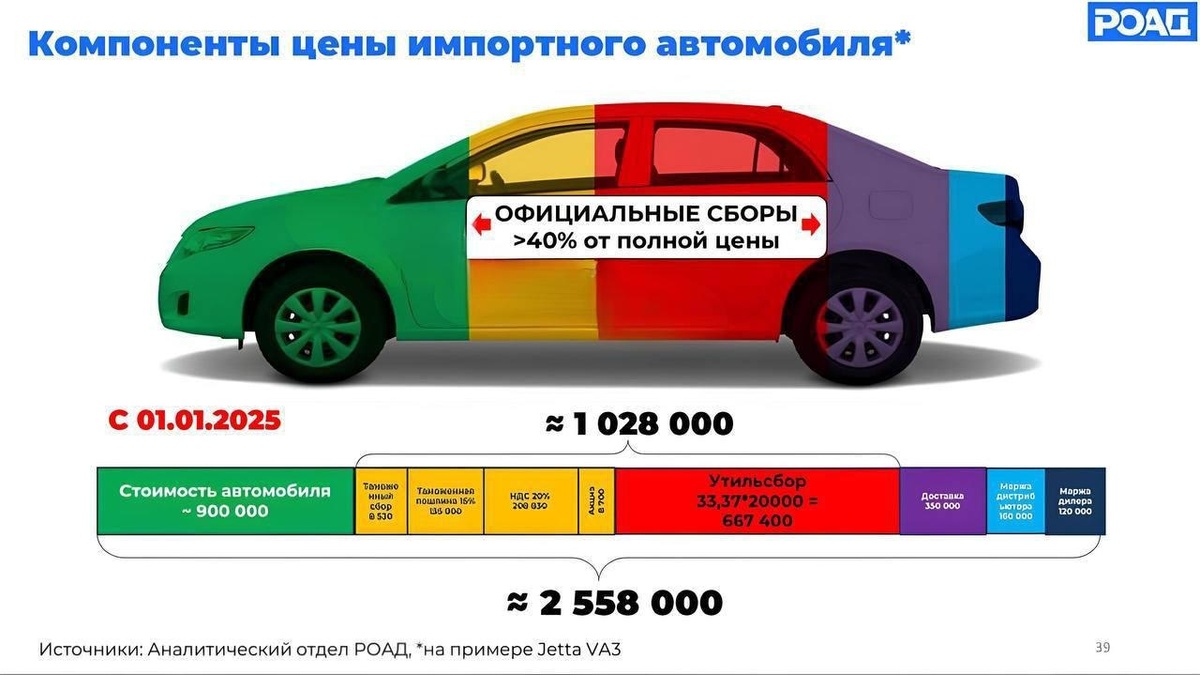 Цена нового импортного авто из Китая, привезённого в Россию, состоит лишь на 35% из стоимости самой машины. Ещё около 40% — это пошлины и сборы, остальное — доставка и наценка дилеров. Такие данные приводит Ассоциация российских автодилеров. @nemediatema