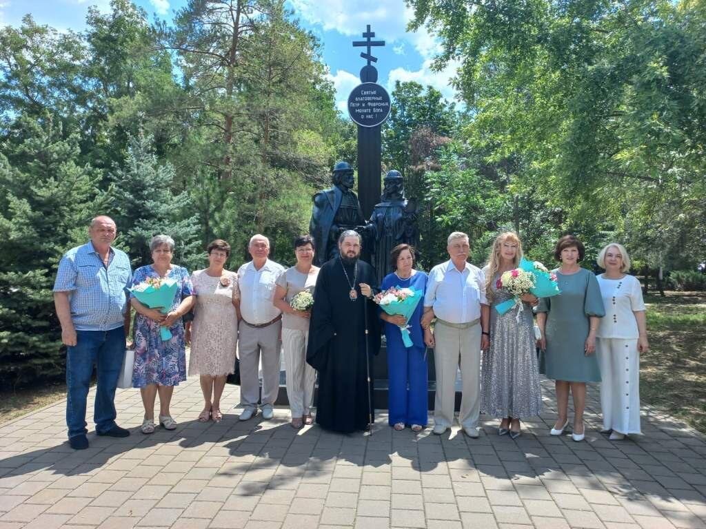В завершение церемонии всем участникам подарили символы праздника-ромашки, цветы возложили к памятнику Петру и Февронии в сквере «Семьи, любви и верности» и сфотографировались на память.