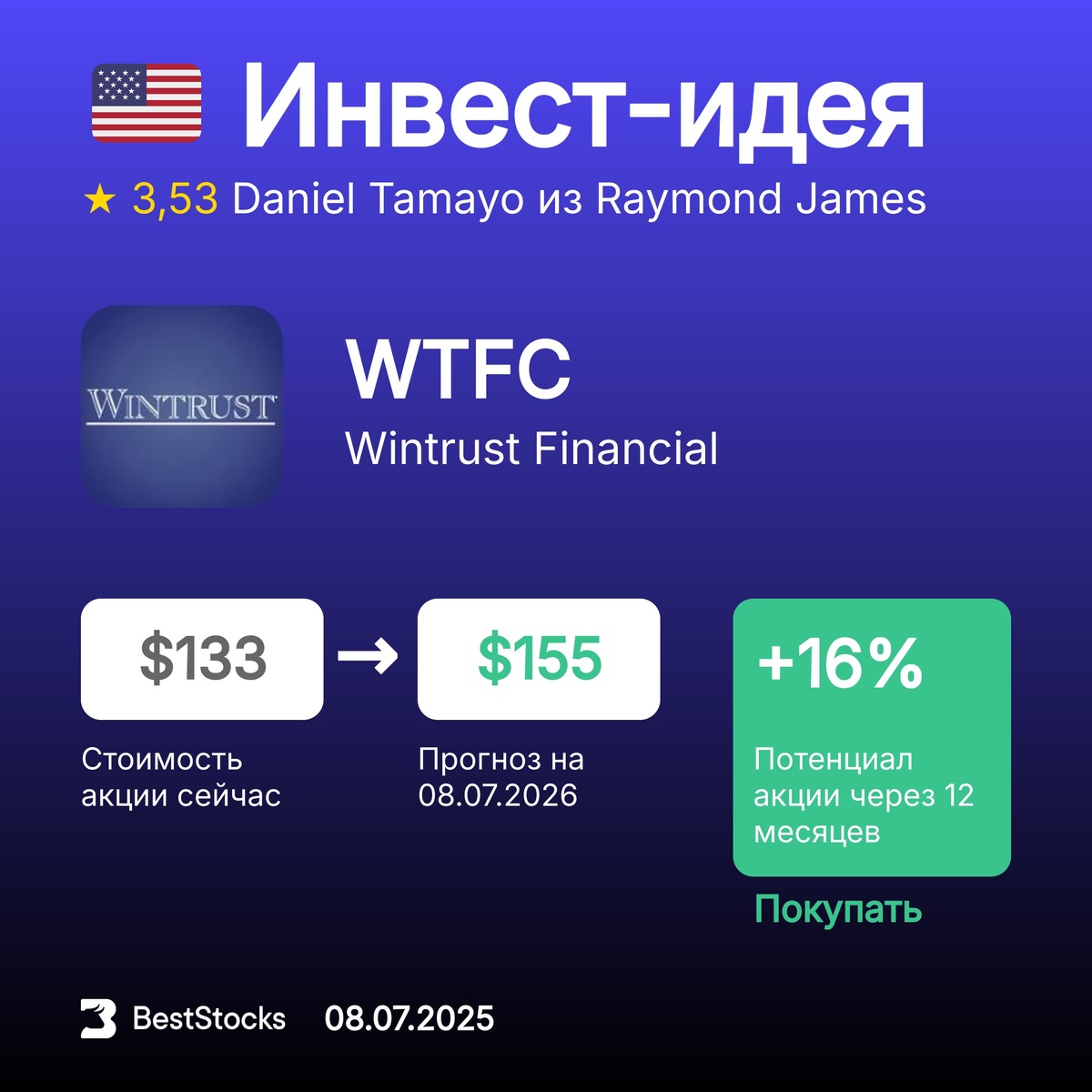 πΊπΈ ΠΠ½Π²Π΅ΡΡ-ΠΈΠ΄Π΅Ρ ΠΏΠΎ Π°ΠΊΡΠΈΠΈ Wintrust Financial Π’ΠΈΠΊΠ΅Ρ: WTFC ΠΡΠΎΠ³Π½ΠΎΠ·Π½Π°Ρ ΡΠ΅Π½Π°: $155 (+16%) Π Π΅ΠΊΠΎΠΌΠ΅Π½Π΄Π°ΡΠΈΡ: ΠΠΎΠΊΡΠΏΠ°ΡΡ InvestRank Π°ΠΊΡΠΈΠΈ: 9 ΠΈΠ· 10 ΠΡΠΎΠ³Π½ΠΎΠ· ΡΠ΄Π΅Π»Π°Π½: 08.07.2025 ΠΡΠΎΠ³Π½ΠΎΠ· Π΄ΠΎ: 08.07.2026 ΠΠ½Π²Π΅ΡΡ-ΠΊΠΎΠΌΠΏΠ°Π½ΠΈΡ: Raymond James ΠΠ½Π°Π»ΠΈΡΠΈΠΊ: Daniel Tamayo ΠΡΡ ΡΠ΅ΠΊΠΎΠΌΠ΅Π½Π΄Π°ΡΠΈΠΈ Π½Π° ΡΠ΅Π³ΠΎΠ΄Π½Ρ β β’β’β’β’β’ π ΠΠΎΠ²Π°Ρ ΡΠΈΡΠ° Π½Π° ΡΠ°ΠΉΡΠ΅ β Π’Π΅ΠΏΠ»ΠΎΠ²Π°Ρ ΠΊΠ°ΡΡΠ° ΡΡΠ½ΠΊΠ°. ΠΡ ΠΌΠΎΠΆΠ΅ΡΠ΅ ΠΎΡΠ΅Π½ΠΈΡΡ Π΄ΠΈΠ½Π°ΠΌΠΈΠΊΡ ΡΡΠ½ΠΊΠ° Π² ΠΌΠΎΠΌΠ΅Π½ΡΠ΅: ΠΊΠ°ΠΊΠΈΠ΅ Π°ΠΊΡΠΈΠΈ Π±ΠΎΠ»ΡΡΠ΅ Π²ΡΠ΅Π³ΠΎ ΡΠ°ΡΡΡΡ ΠΈΠ»ΠΈ ΠΏΠ°Π΄Π°ΡΡ, ΠΊΠ°ΠΊΠΈΠ΅ ΡΠΎΡΠ³ΡΡΡΡΡ Π±ΠΎΠ»ΡΡΠ΅ Π΄ΡΡΠ³ΠΈΡ