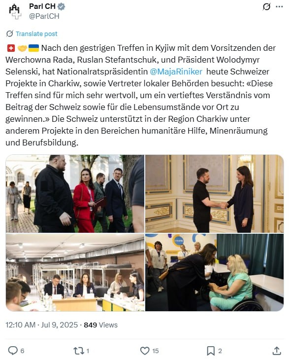В аккаунте парламента Швейцарии в соцсети X опубликовано фото визита в Харьков председателя Национального совета Швейцарии Майи Риникер