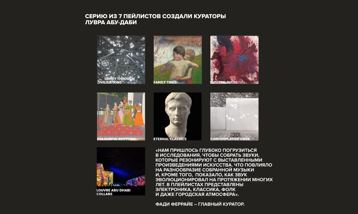 Кураторы Лувра Абу-Даби создали серию из 7 плейлистов, которые могут сопровождать зрителей по коллекции музея, рассказывая о работах, стилях на универсальном языке музыки.