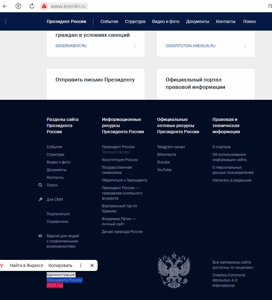 Пасхалка на сайте президента В подвале сайта kremlin.ru, если выделить текст "Администрация Президента России 2025 год", то он выделяется триколором. http://www.kremlin.ru Еще одно подтверждение, что в нашем государстве работают душевные люди с тонким чувством вкуса.