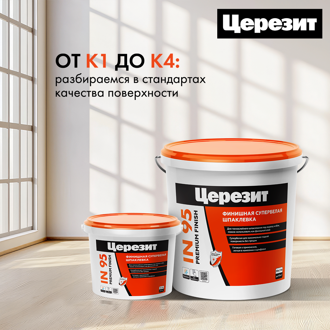 К1 — допускает отклонения по вертикали 3 мм на 2 погонных метра, видимые выемки, царапины, задиры и отпечатки от инструментов глубиной до 3 мм, локальные наплывы штукатурного или шпаклёвочного раствора высотой не более 2 мм, а также тени от бокового света.