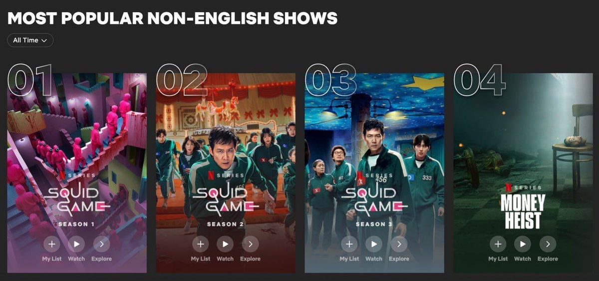 Игра в Кальмара самое популярное шоу на Netflix. Первые 3 места занимают разные сезоны сериала.