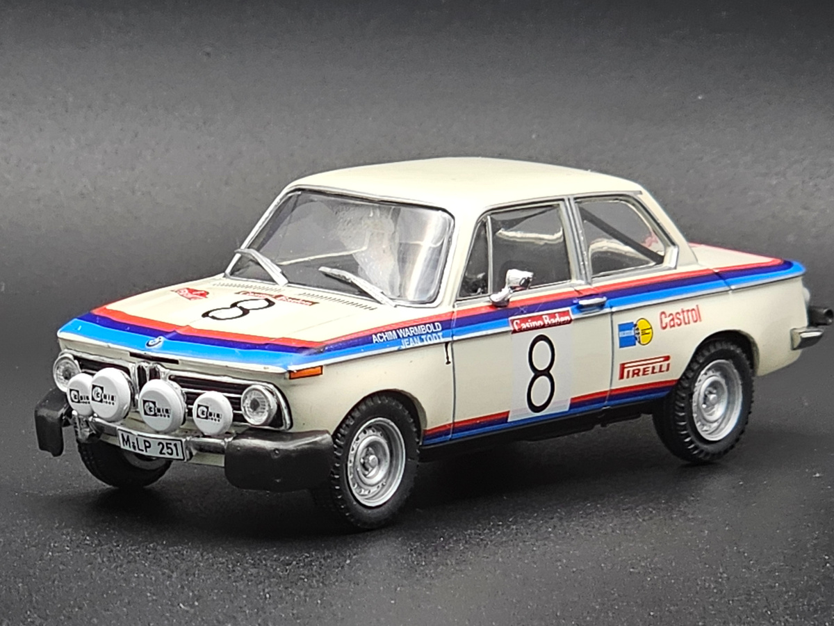 Обзор модели BMW 2002 Ti, Vainqueurs de Rallye 15 от компании Altaya в масштабе 1/43. Немного о настоящем автомобиле: Многие считают, что BMW плохо подходит для ралли, и что кредо этой марки — асфальт. Но это далеко не так! Начнем знакомство с раллийной BMW 2002... В начале 1970-х, когда баварцы занимались продвижением модели 2002 BMW приняли решение выставить заводскую команду для участия в ралли. Для этой цели в 1971 году было создано отдельное раллийное подразделение. Возглавил его чемпион Западной Германии по ралли 1969 и 1970 годов Хельмут Бейн. Раллийную машину оснастили двигателем мощностью 120 лошадиных сил с двумя карбюраторами, пятиступенчатой коробкой передач, и в том же 1971 году выпустили на старт. Лучшим результатом в дебютном сезоне стало третье место экипажа заводской команды на Alpine Rally, входившего в зачет Международного чемпионата для производителей (собственно WRC начал проводиться лишь в 1973 году). В 1972 году BMW удачно выступила на Ралли Акрополис. Три б